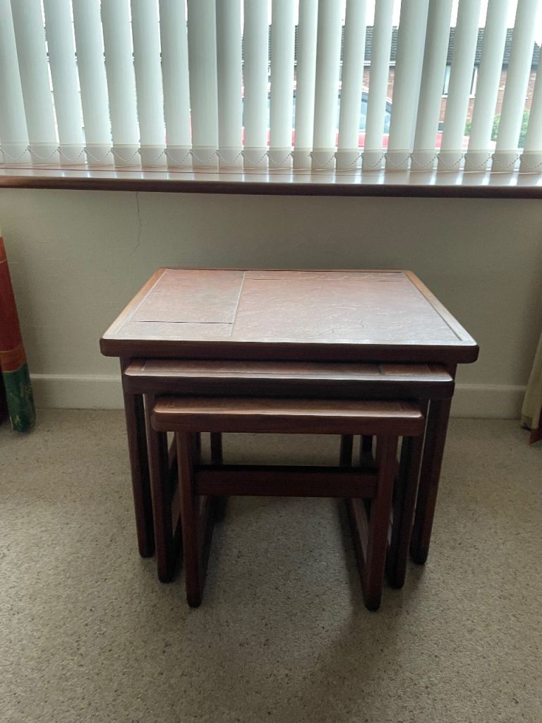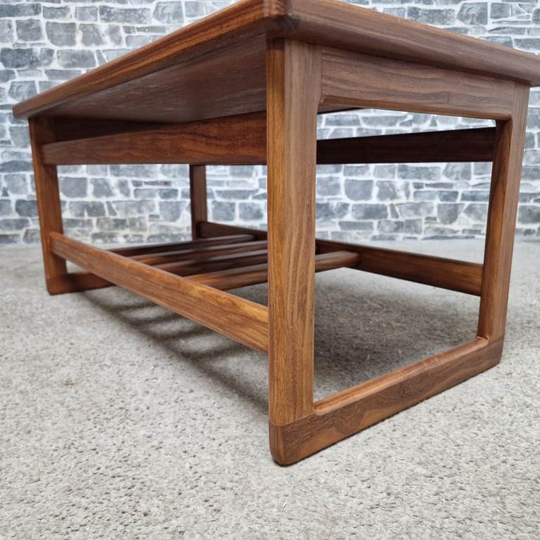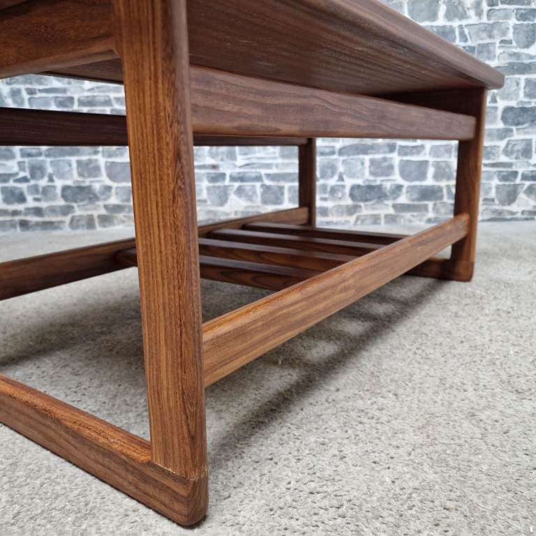 Vintage mid-century teak coffee table featuring a ceramic tile top set within a solid teak frame. The table includes a practical slatted lower shelf, ideal for magazines or books, and shows the classic clean lines associated with mid-century design. It’s in great condition overall, with the tiles intact and the teak frame solid and well cared for, showing only very light signs of age-related use. A stylish and functional piece that works well in both modern and retro interiors. Dimensions: L 85 x D 45 x H 40 cm