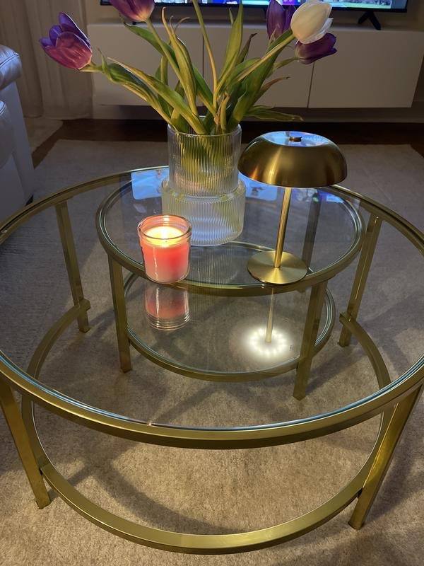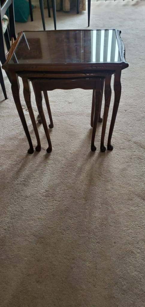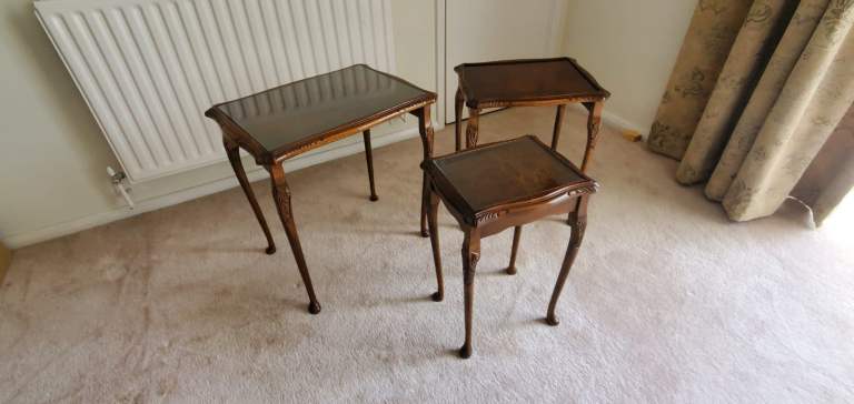 Solid and sturdy, the tables slot neatly together to conserve space. Ideal side tables or lamp tables, practical and stylish. Lovingly cared for and looked after, showing minimal signs of usage.