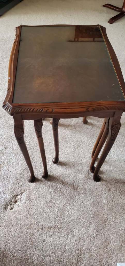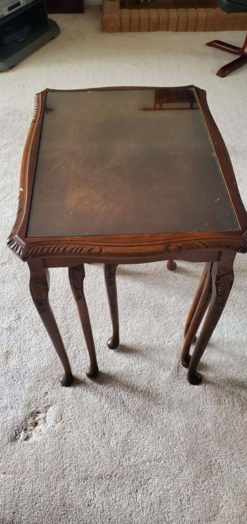 Elegant set of 3 vintage nesting tables in dark wood (thought to be mahogany). Classic Queen Anne style with curved cabriole legs. Removable, protective clear glass inserts on the large and small table tops (the middle table is missing its insert, but this could easily be replaced).