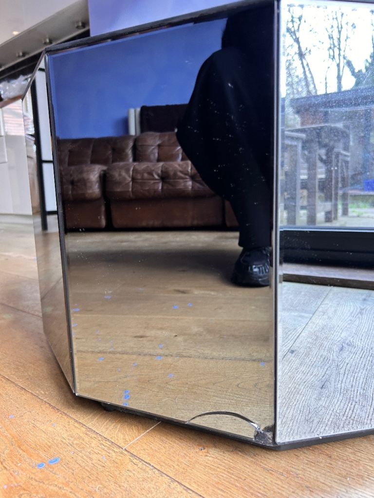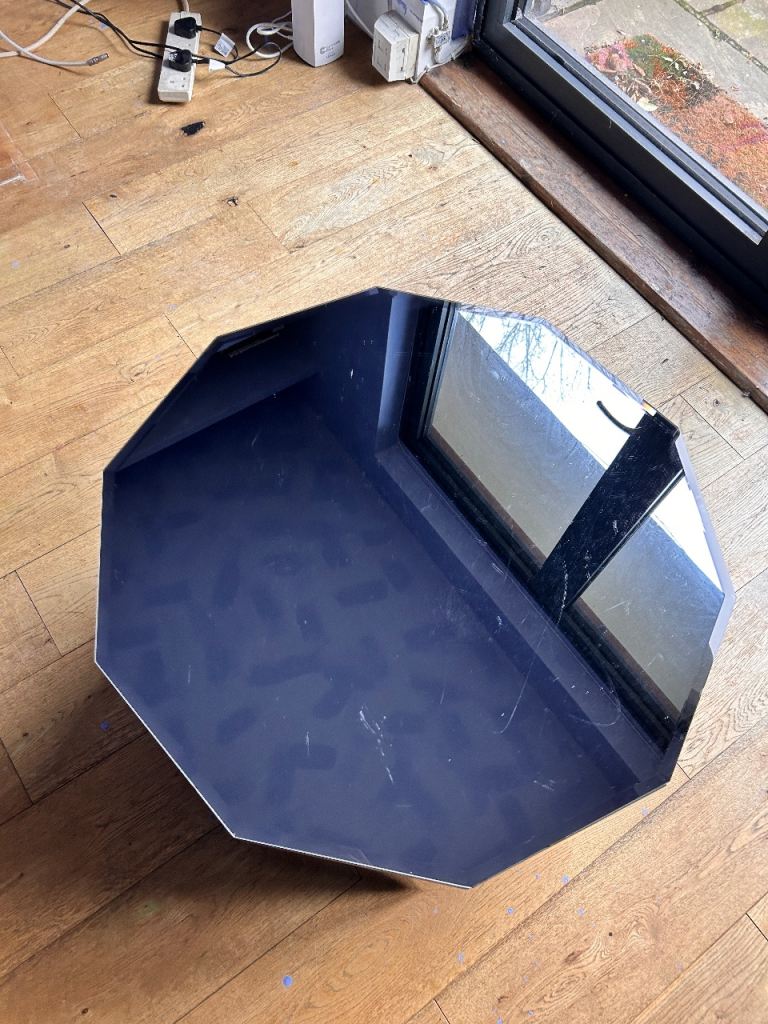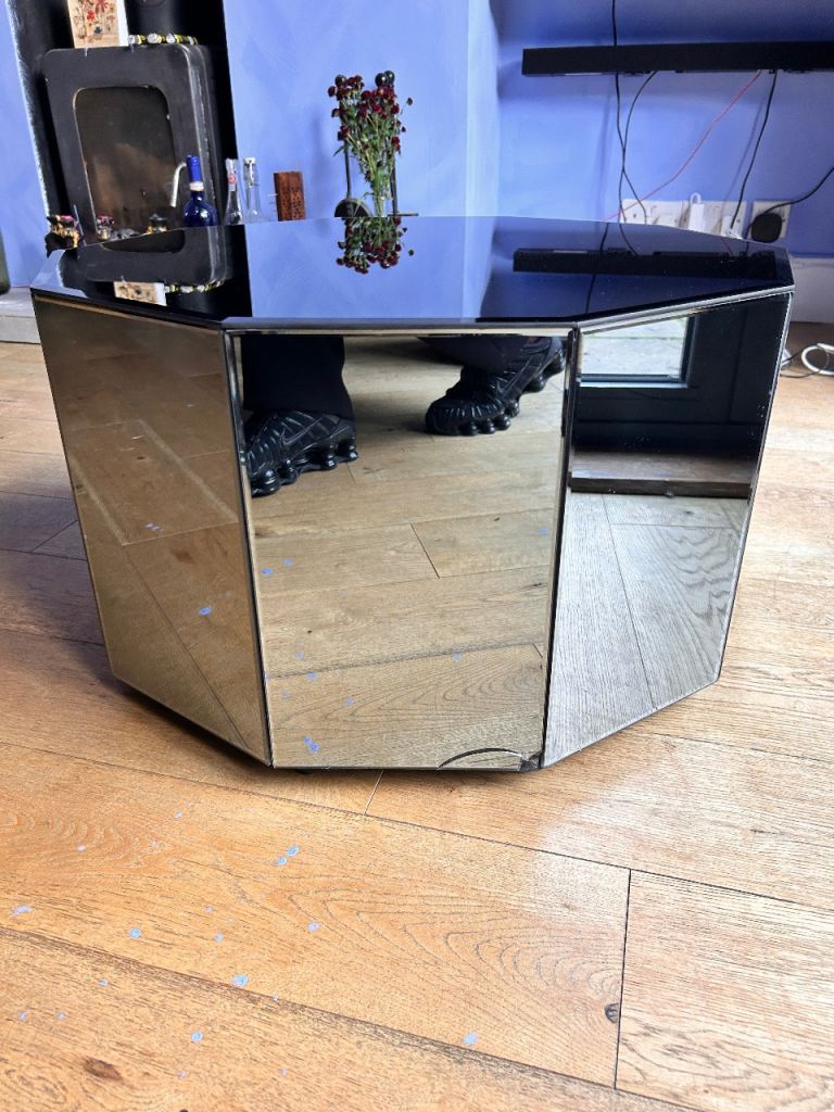 Decagon mirrored coffee table podium with beveled edges.