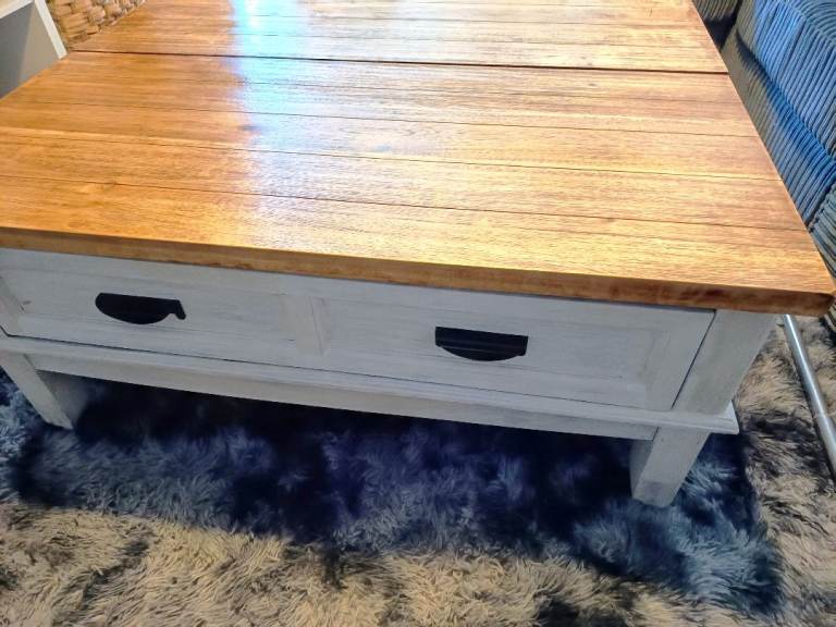 Lovely Whalen lift top table. Distressed/rustic finish and tons of storage. Lifts on one side, drawer on the other. Heavy, solid wood. Reluctantly selling because it is too square for our new living room. Open to offers.