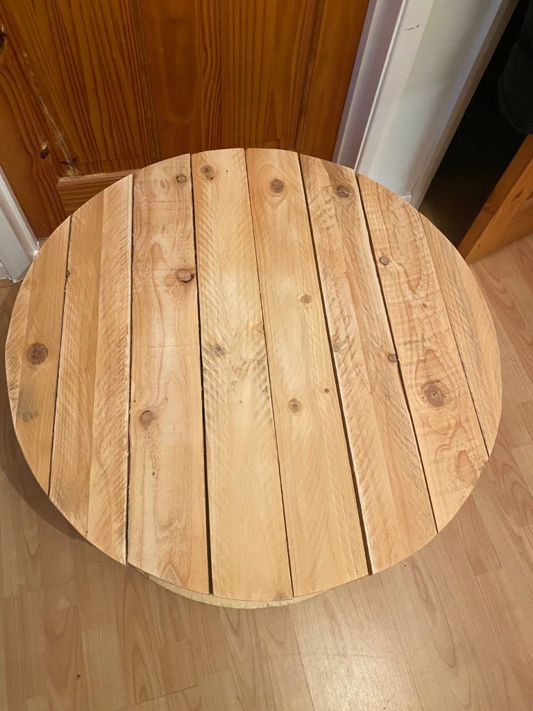Recycled wooden cable drum coffee table - with sanded wooden top and rope covered spindle.