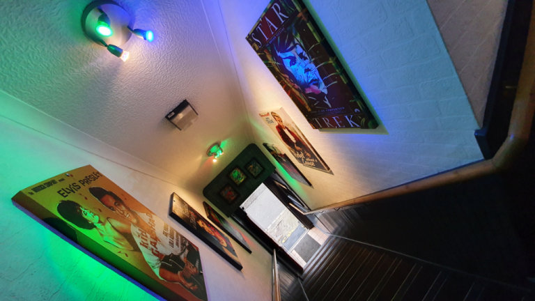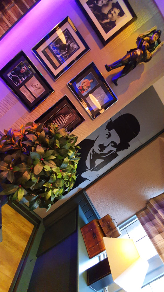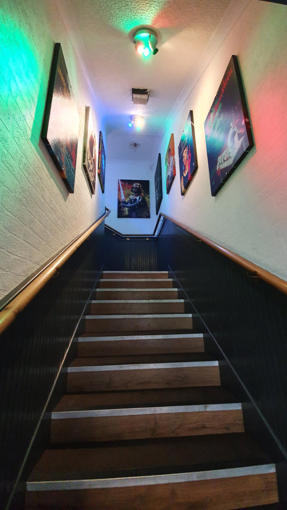 The interior of the bistro is modern and stylish, equipped with ambient lighting. The bar and dining area are fully equipped, providing a cozy seating ambiance for customers. The property also includes clean and well-maintained restroom facilities. The appealing décor featuring artwork and pop culture references add to the warm and inviting atmosphere, making it suitable for a variety of occasions.