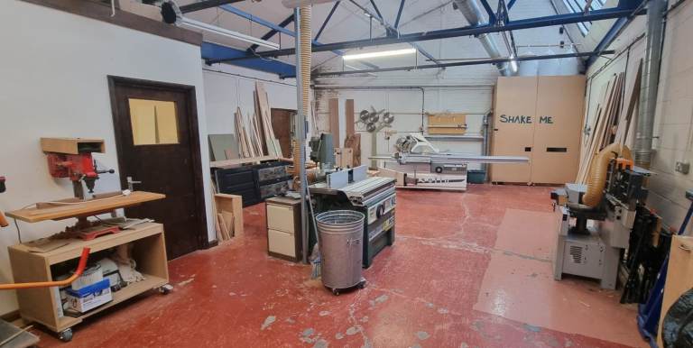 The workshop comprises a machine room, assembly room, drying room, loading bay, board storage, kitchen, toilets and a little outdoor space. In the assembly room there are 7 other makers who each have a similar space. The main rooms benefit from natural light and gas heating.