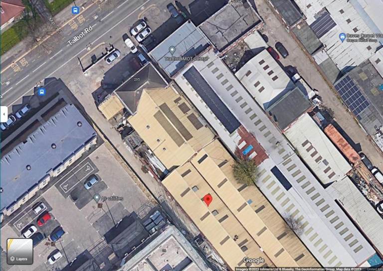 295 Talbot Rd, Stretford, M32 0YA. Commercial Unit with Spray Booth 5m x 6 m inside the unit 18m 30m , with high ceilings. It has a private entrance from Talbot Rd. with a heavy-duty dent puller, 5,500 sq ft floor space, plus outside parking with roller shutters, big enough for vans. It has a separate office with the kitchen and toilet within the unit . It can also be used as a large warehouse for distribution or storage. (£7.00 per sq ft.)