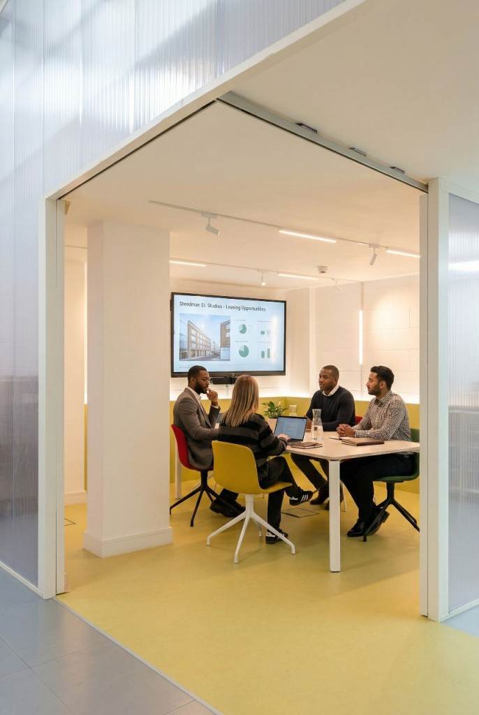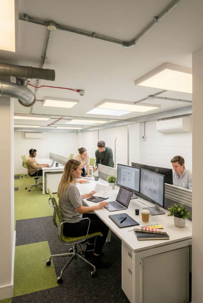 The building features a warehouse-style contemporary interior, air conditioning, modern LED lighting, and high-speed fibre connectivity, making it ideal for design-led and creative industry occupiers such as architects, engineers, graphic designers, product designers, digital agencies, or planning consultants.