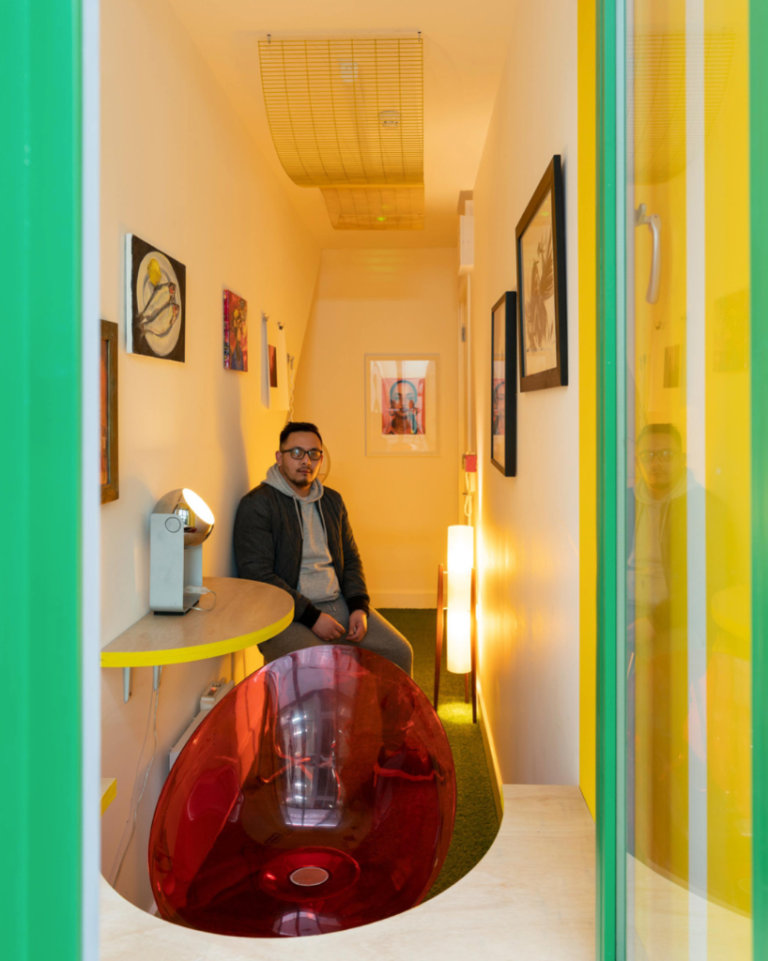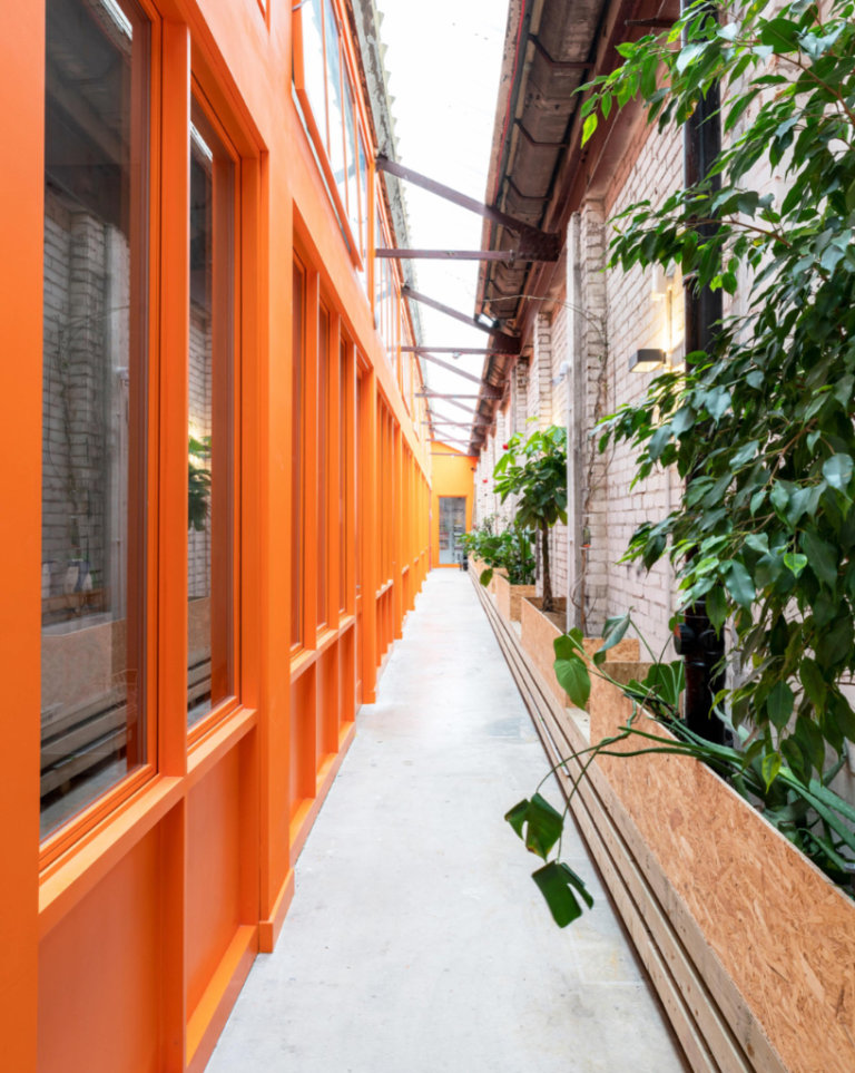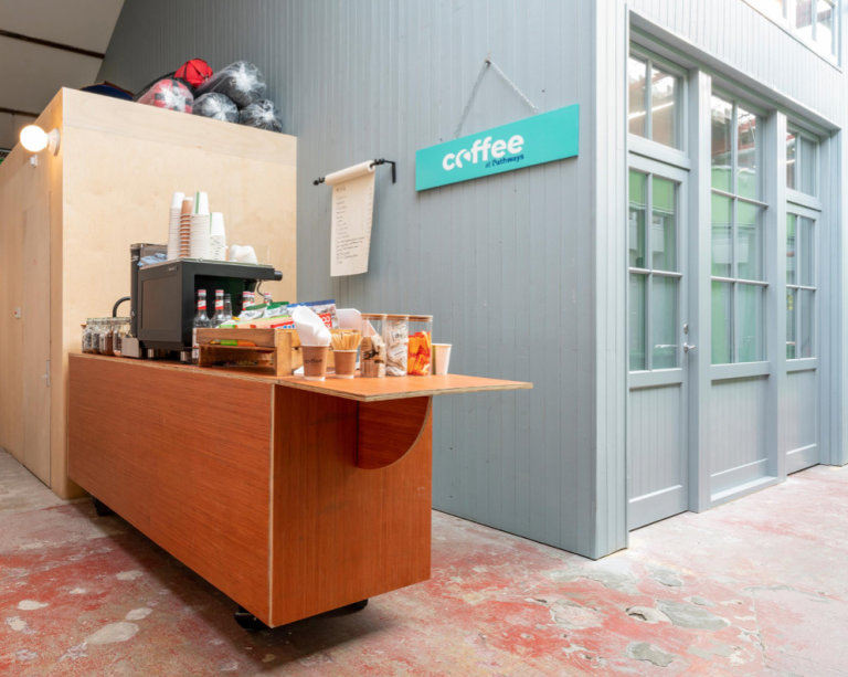 Communal seating areas, coffee cart in the lobby area, bike repair and servicing shop.