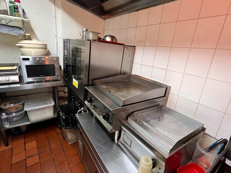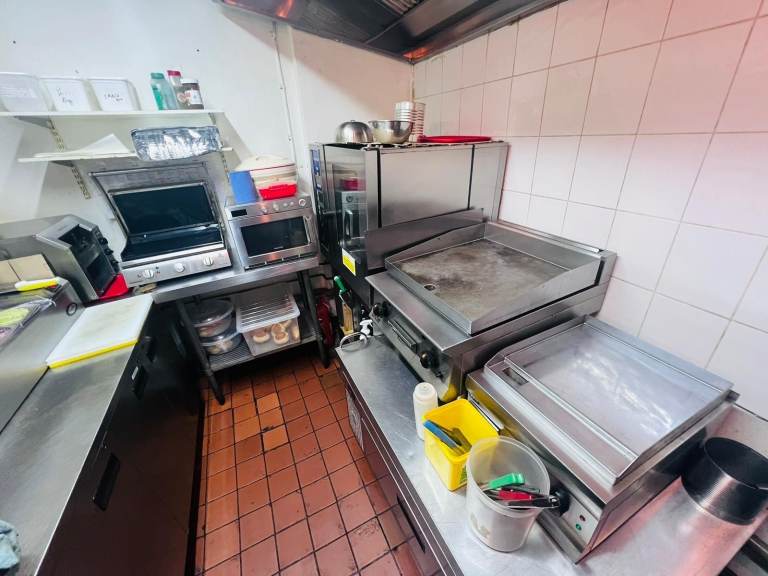 Griddle, oven, fridge, freezer, fryer. FSA 5 stars. All bills included. Storage downstairs. 2 venue options: Rent - £2000 per month for back kitchen; Lease - £75,000 for the lease for the whole shop.