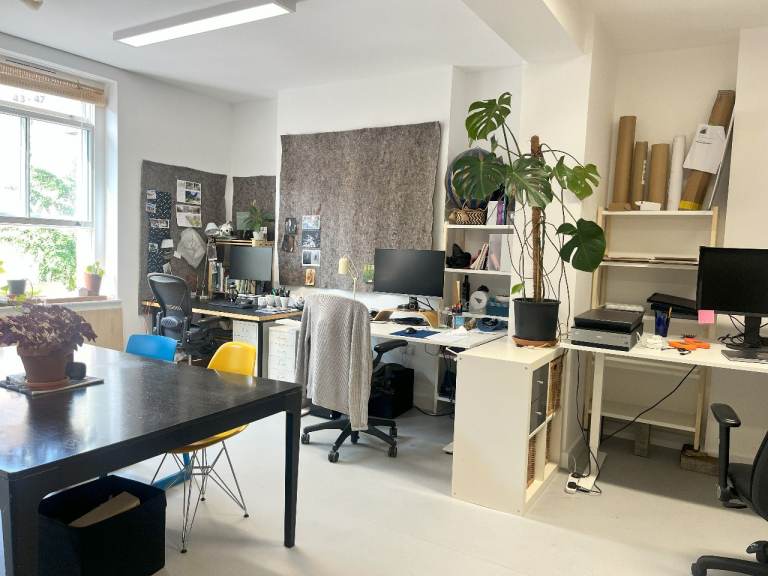 We have 1 desk space (see photo 2) available to rent in our studio in Bradbury Works in Dalston.