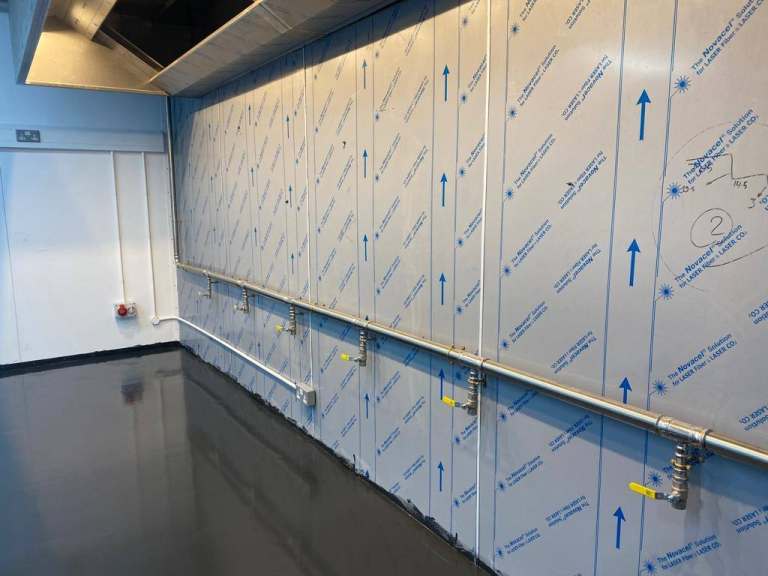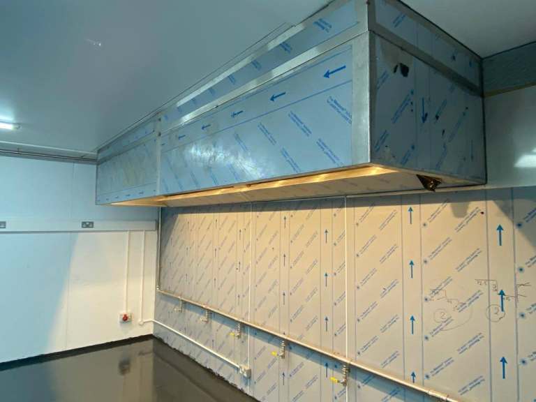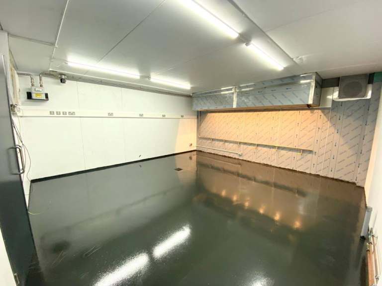 The unit comprises of 3m extractor fan, fresh air intake, 5 gas outlets, 3 phase electric (40 Amps) with on floor drainage. Licensed for production, catering and food delivery.