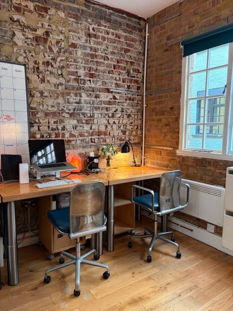 Two workspaces in a converted Hay Loft/stable, in a secluded Soho Mews, original brickwork, natural light with windows front and back. Fabulous Fred Scott designer chairs and handmade under desk storage units, WiFi, Sonos, printer and stationary, cosy vintage seating area, hot/cold filtered water, tea/coffee etc, microwave/toaster/fridge station, shower, dog friendly, access to outside space. £600 p/m per desk or £1100 p/m for the pair. Monday - Friday 9am to 5:30pm (but flexible). Saturdays by arrangement. Would suit creative; writers, stylists, marketing arty-types. Private message Kiki if you fancy popping round for a nosy and a cuppa.