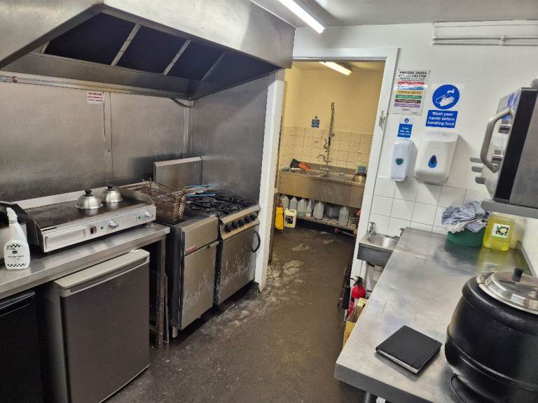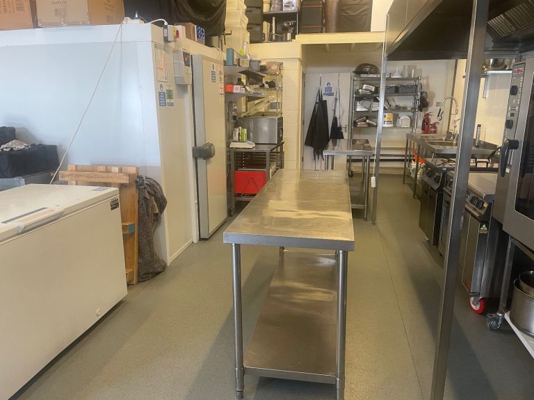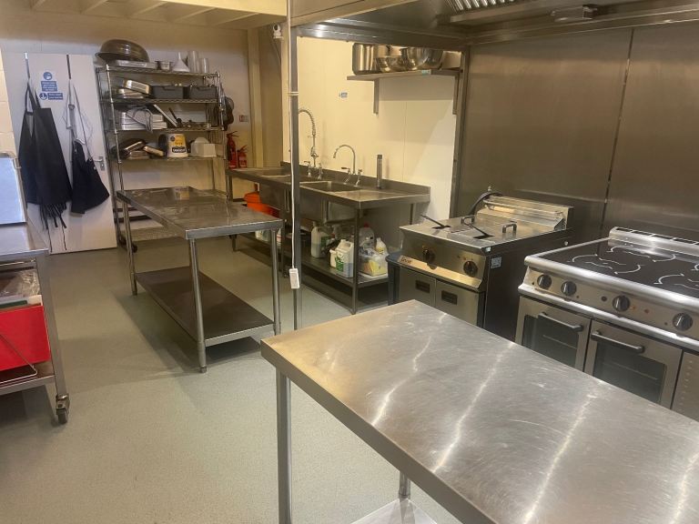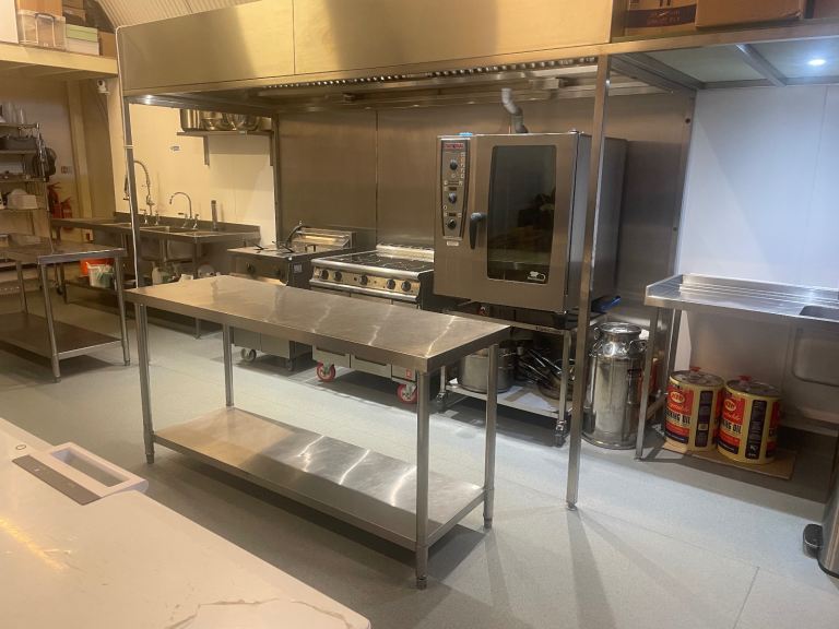 stick blender, work benches, large double sink, single food prep sink, full extraction canopy,