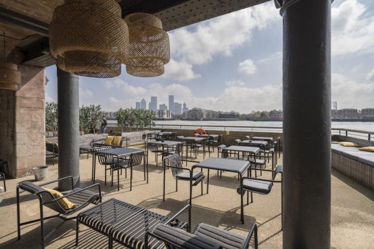 The complex also boasts a characterful communal space on the ground floor where tenants can have a coffee, host meetings or relax on the egg chairs on the terrace overlooking the river Thames.