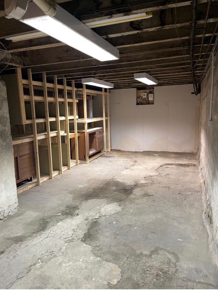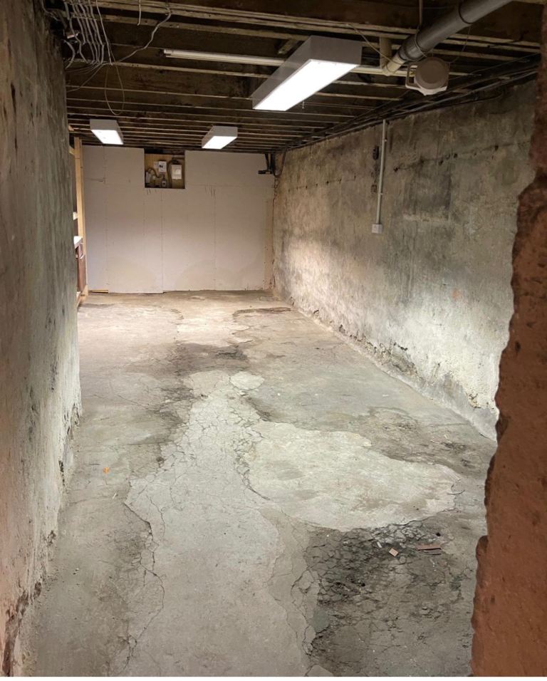 Solid concrete floor, painted brick walls, and overhead fluorescent lighting