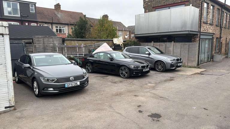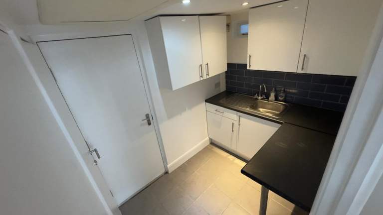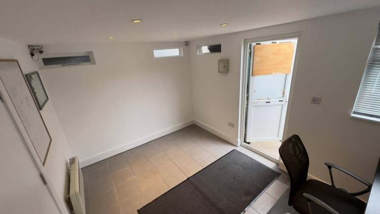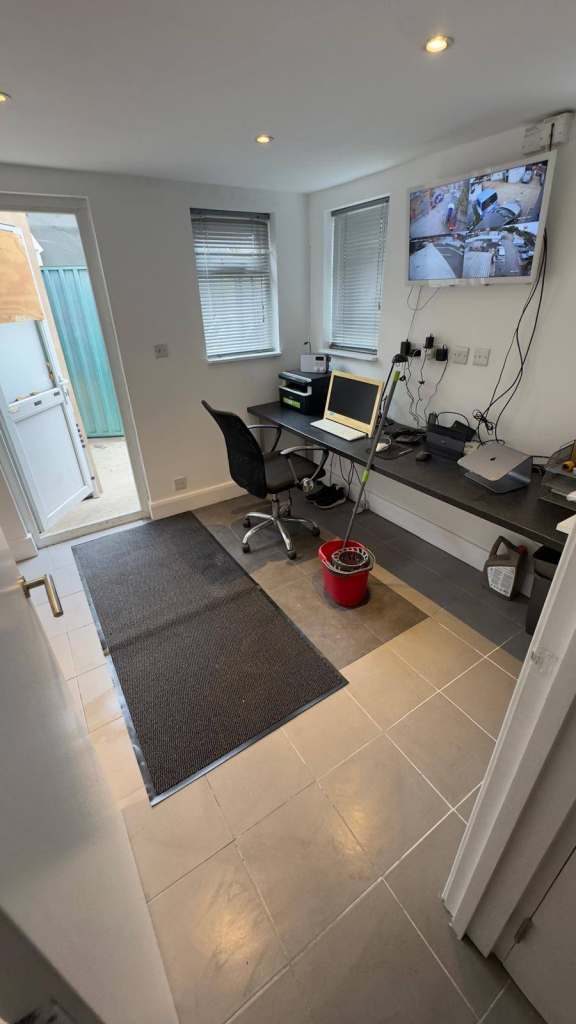 Office space for rent, approximately 12 m², with a desk and two computer stations, and the possibility of adding a small desk. The office is equipped with high-speed internet and CCTV. The office includes a small kitchen, toilet, and shower. Parking is available for rent at £200 per month per car. Maximum occupancy: 4 cars.