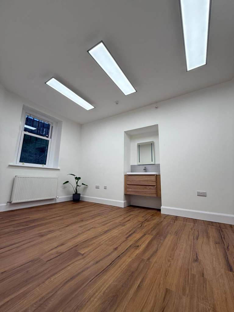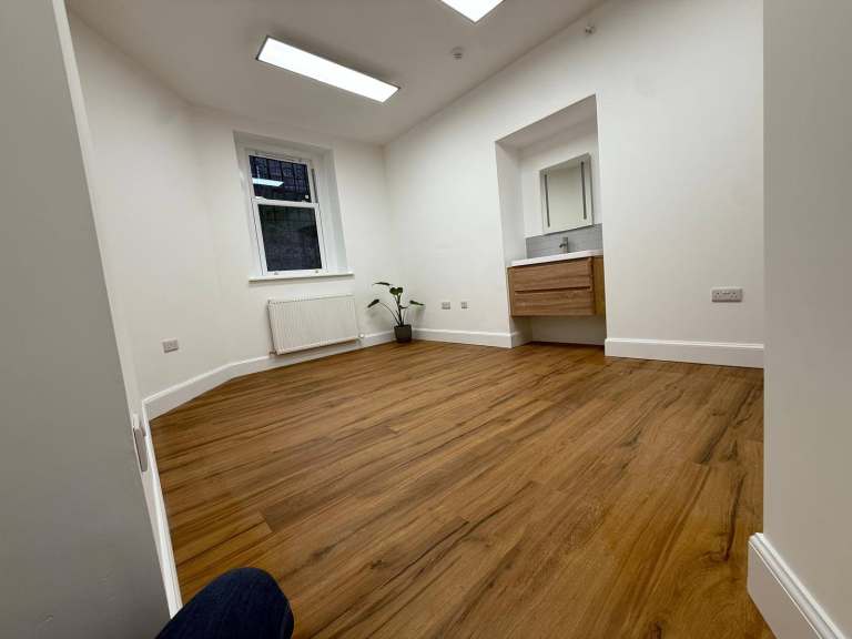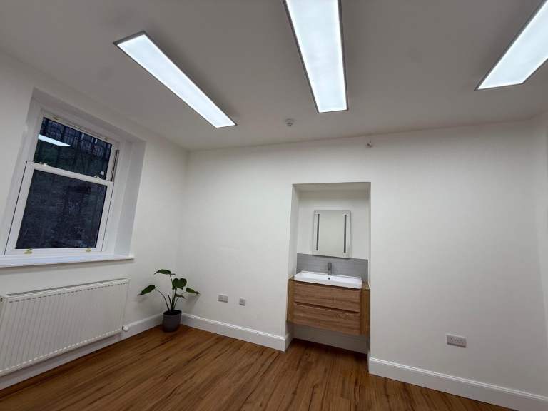 Bright, newly refurbished first floor private office space with built-in sink and vanity—ideal for wellness, aesthetics, consulting, or small professional practice.