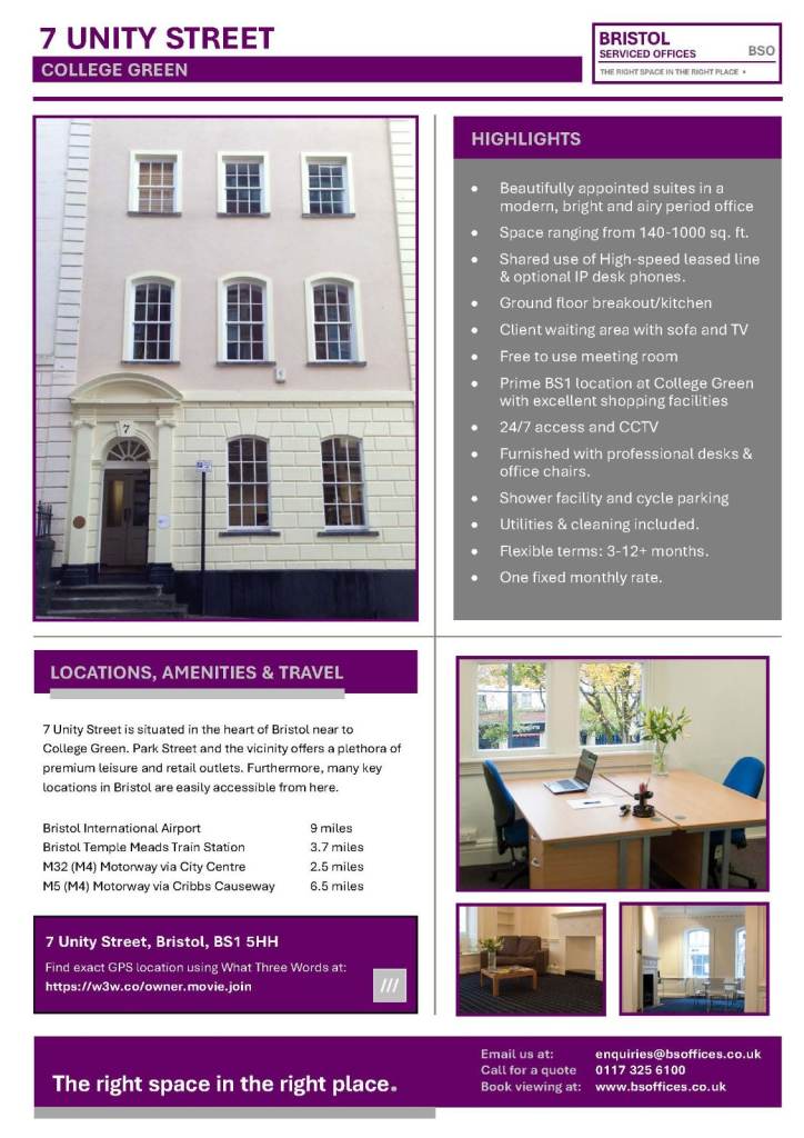 Prime City Centre 4 desk (240 sq ft) fully serviced office space in BS1 at 7 Unity Street.