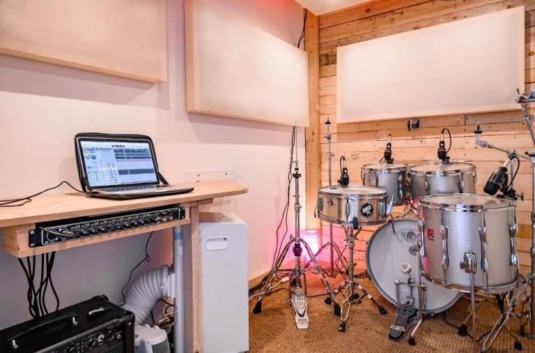 RECORDING BOOTH WITH DRUMT KIT / GUITAR AMP AND MONITORS :
