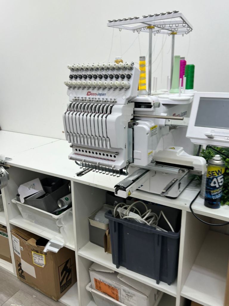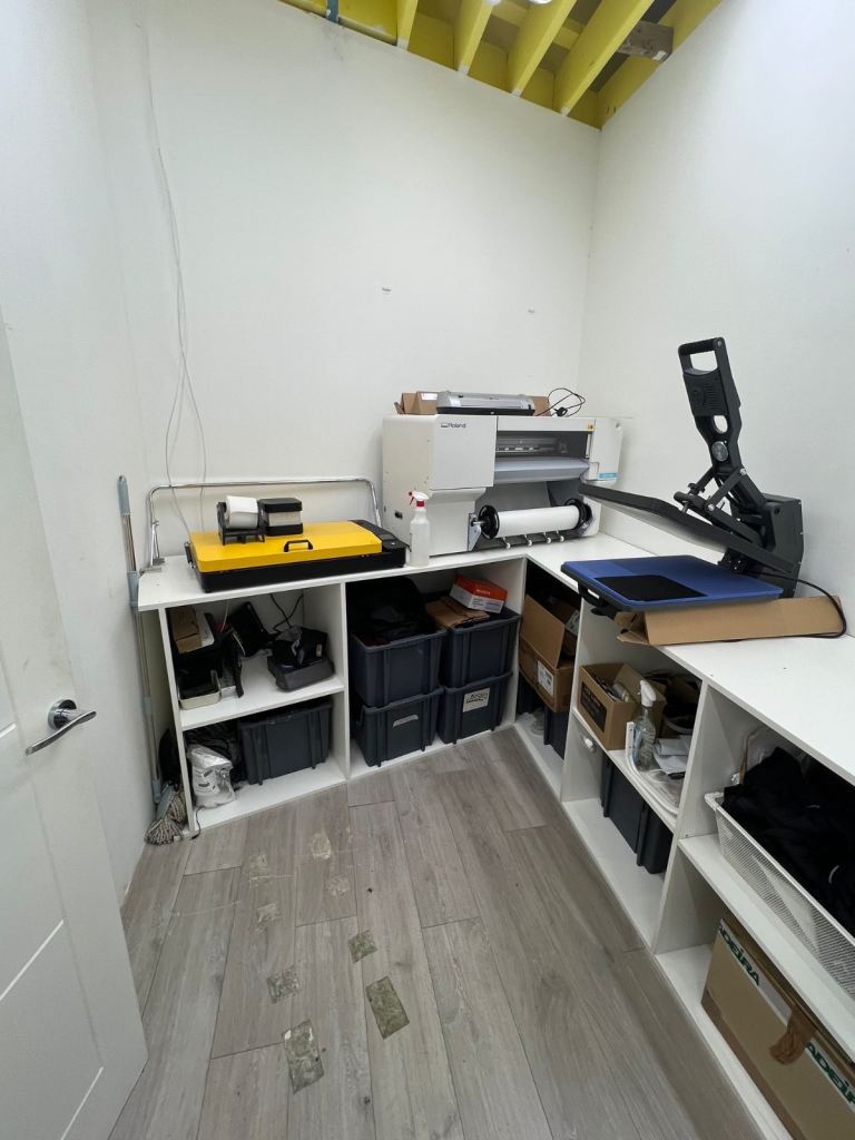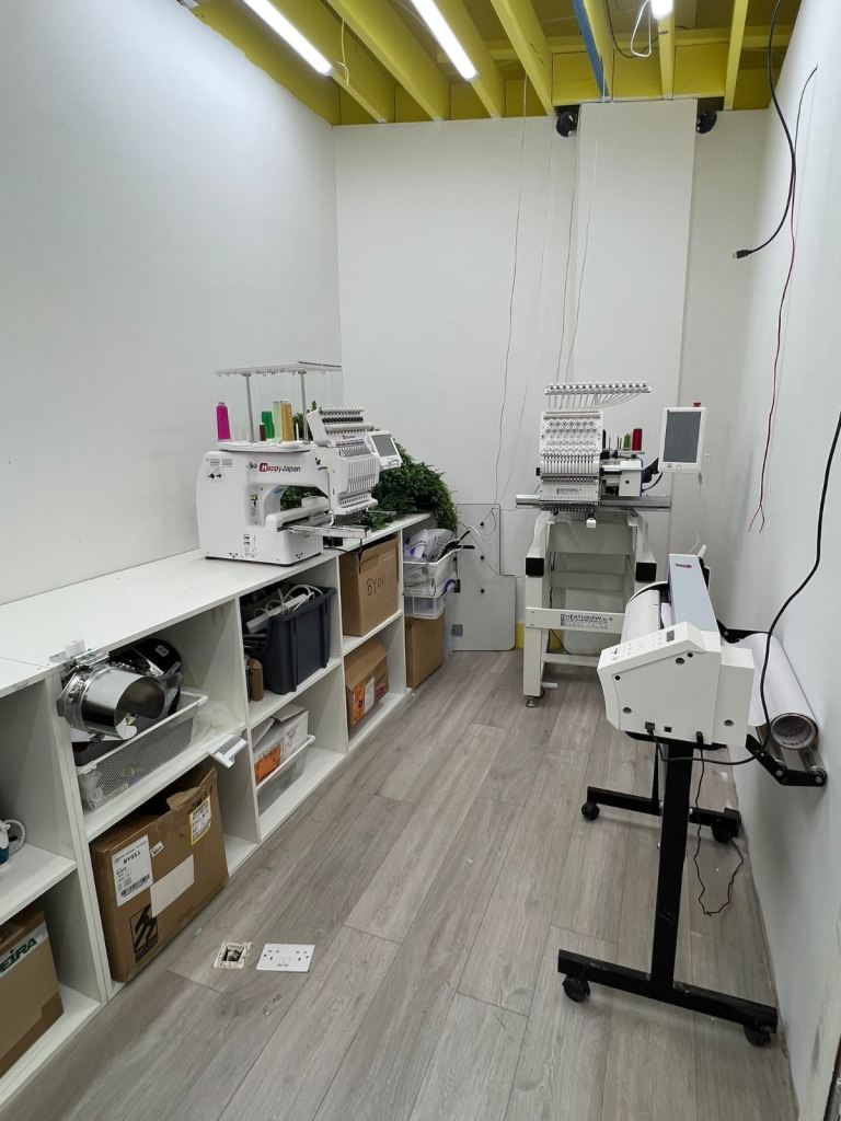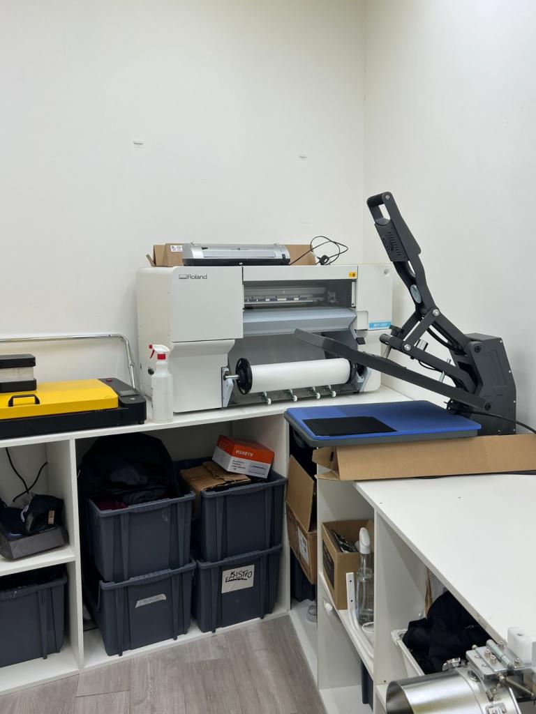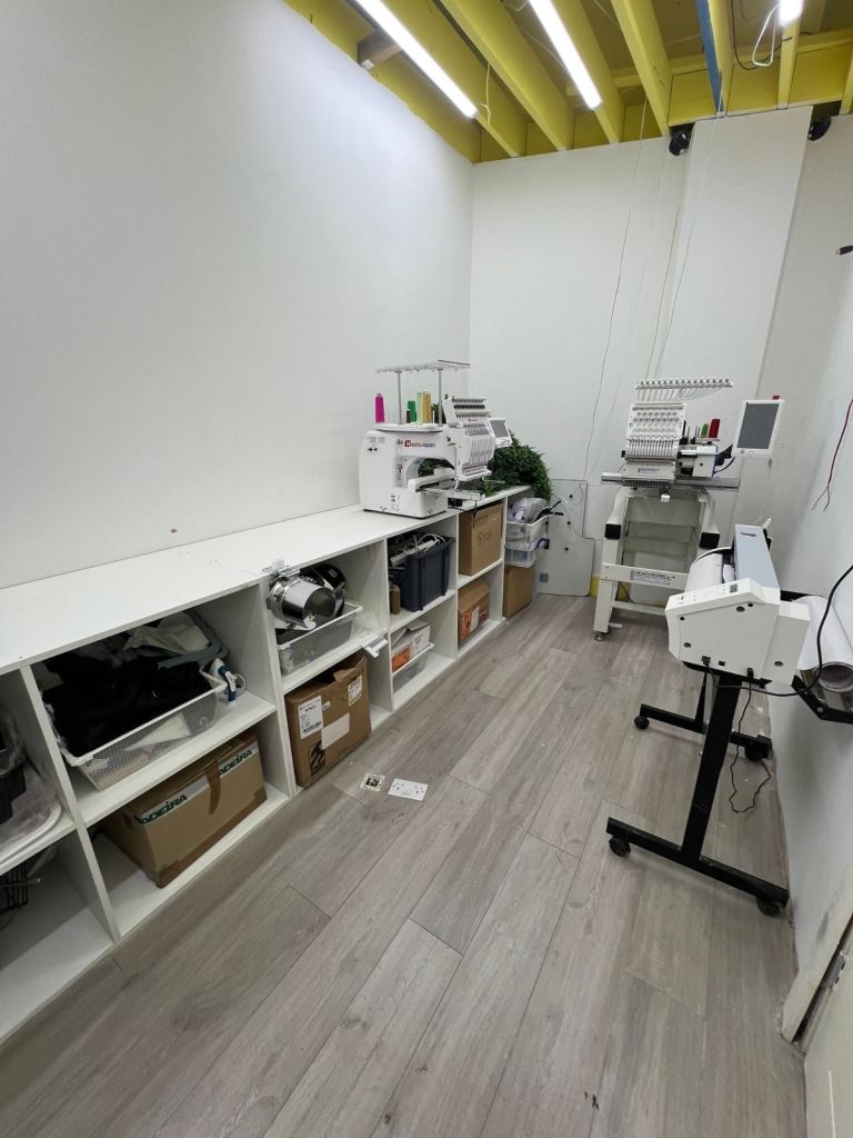The shop currently contains professional printing and embroidery equipment (DTF, vinyl, embroidery machines, cutters, heat press etc.).