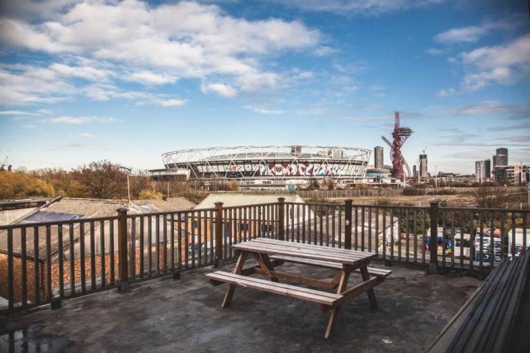 We have an established community of more than 200 creative businesses which include studios and offices for creative agencies, design, fashion, music, art and photography as well as workshops for set builders, ceramicists and makers. The campus offers a shared roof terrace with impressive views of the Olympic Stadium as well as a long stretch of riverside outdoor breakout space, a gym and a cafe on site.