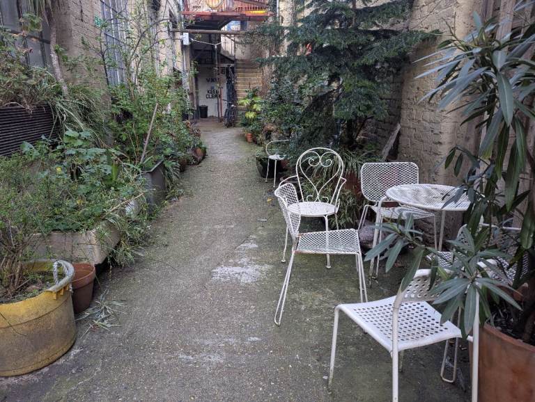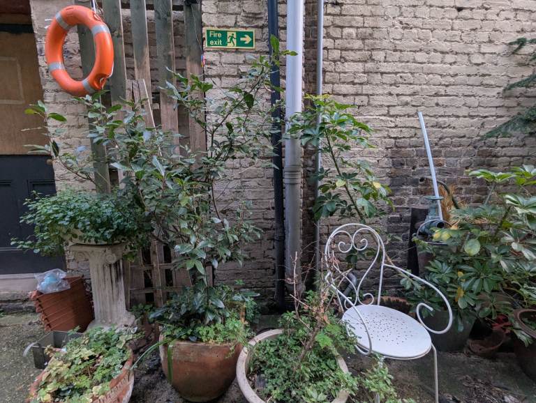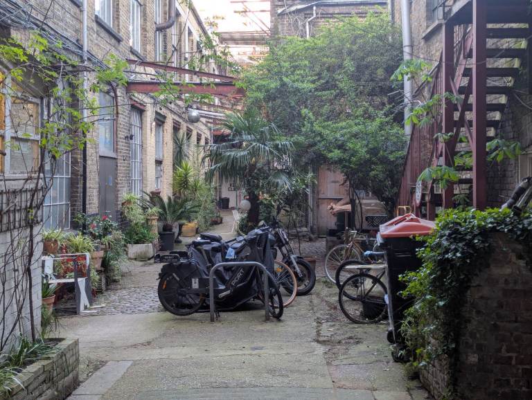 24 hour access, a lovely plant-filled courtyard in a heritage building in Hackney. Coffee shop downstairs.