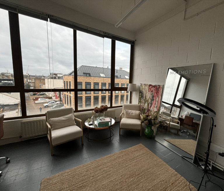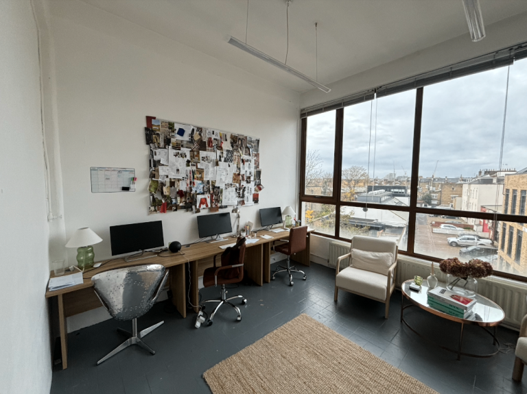 Sub-let a fully furnished studio on 2nd floor of a serviced block shared with other creatives for March/April/May 2026. Beautiful 195 sq ft fully furnished office space with amazing natural light, large windows, clean white walls, built in desks and storage area.