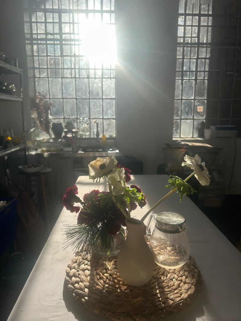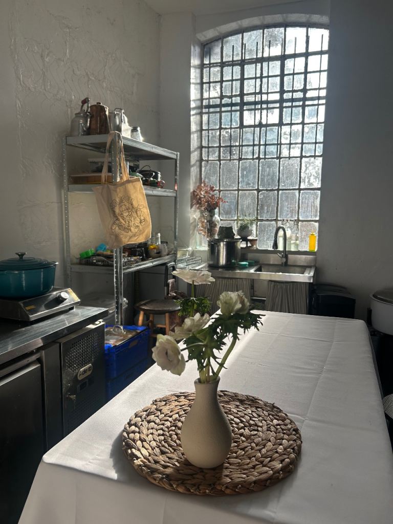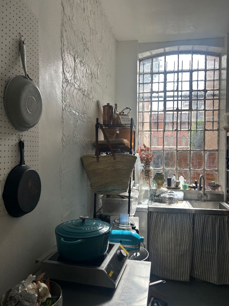 The kitchen is part of a calm, shared creative studio alongside a florist and a jewellery maker, giving the space a quiet and inspiring atmosphere. The kitchen area itself is fully set up for independent use.