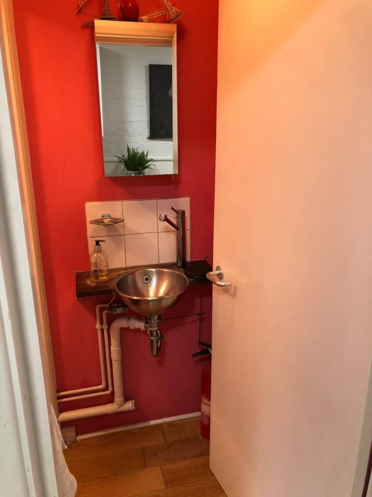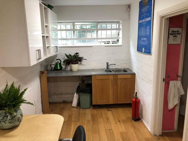 There's a small kitchen with dishwasher and fridge-freezer, as well as a toilet in a room to the rear and a meeting space with large table and room for meet-ups or lunch right at the front of the shop.