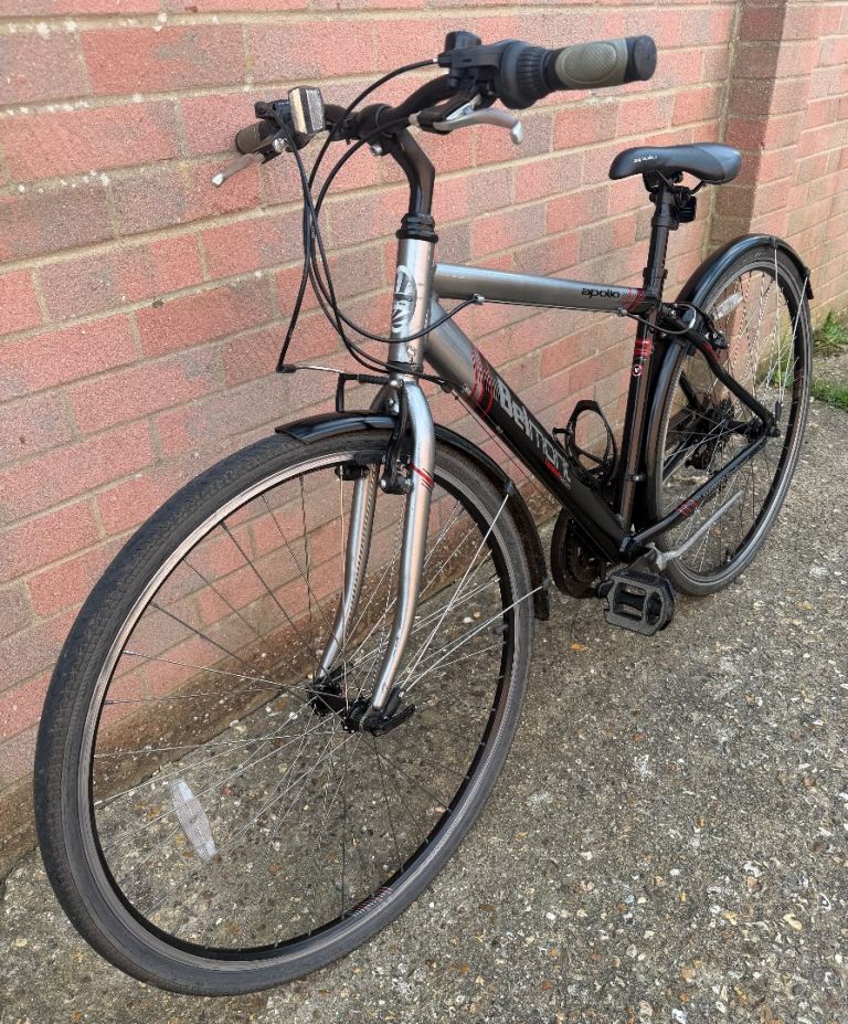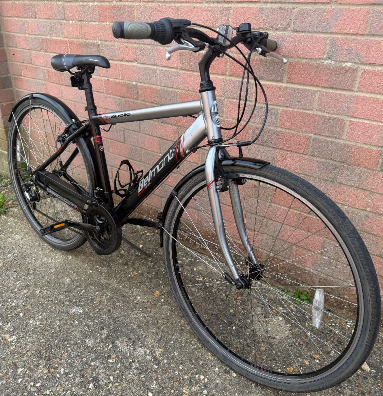 Apollo Belmont hybrid commuter bike, 18" medium size aluminium frame, 18 speed Shimano gears, 700c wheels, mudguards, kick stand, bell, bottle cage, reflectors, lock included. Has a few marks from use, clean overall, been checked over - all working fine. £70.