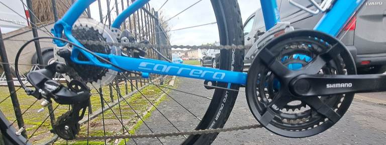 Carrera Crossfire MTB in as new condition with 700 wheels and dual disc brakes, it has 24 speed gears 3x8, A Frame size of 45cm (18"), a seat height from the ground of 80cm upto 95cm, serviced and ready to go,