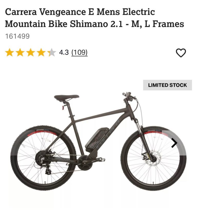 Selling my Carrera Vengeance-E Men’s Electric Mountain Bike (Shimano 2.1) in very good condition. Large frame