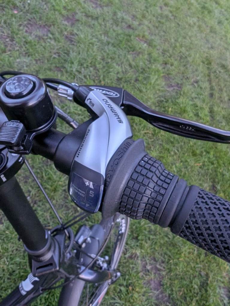Components: Equipped with Shimano Revoshift 8-speed gears, V-brakes, mudguards, rear pannier rack, and integrated lights.