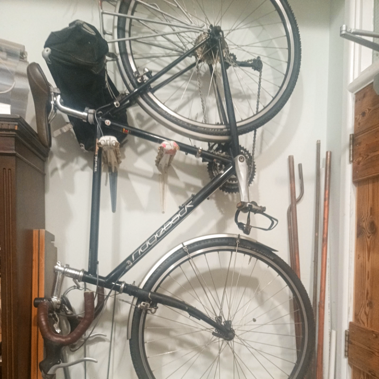 Surface corrosion visible on chain and minor scuffs to crank arms and saddle edge — purely cosmetic and inexpensive to address if desired.