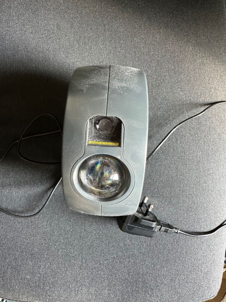 In great working condition Sky Lite. Can be controlled by an app, as well as the device itself. Has green, blue and red lights, with laser like stars.