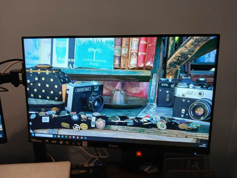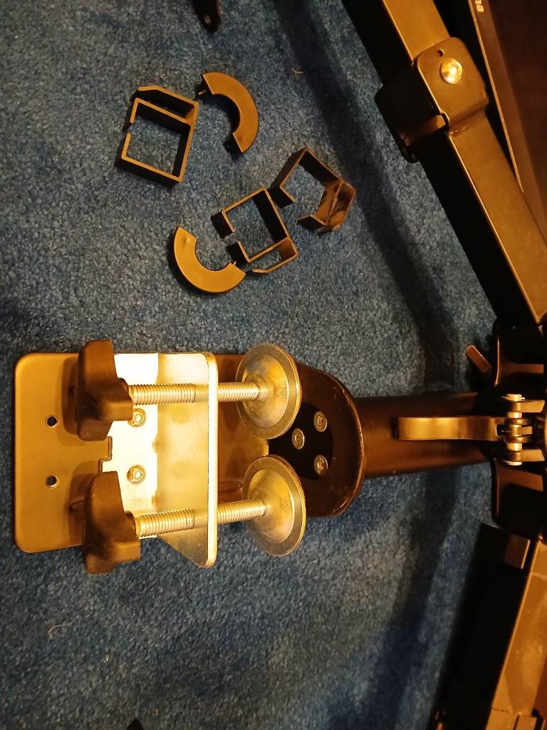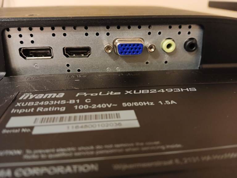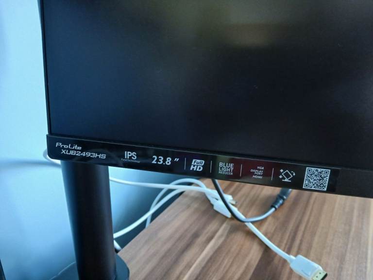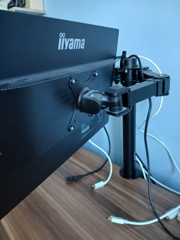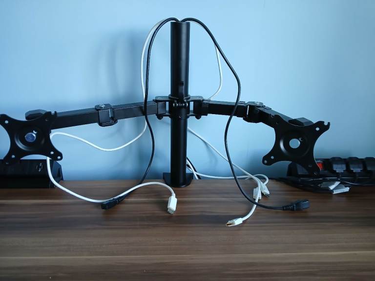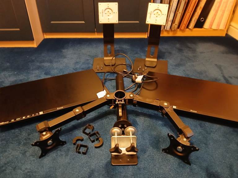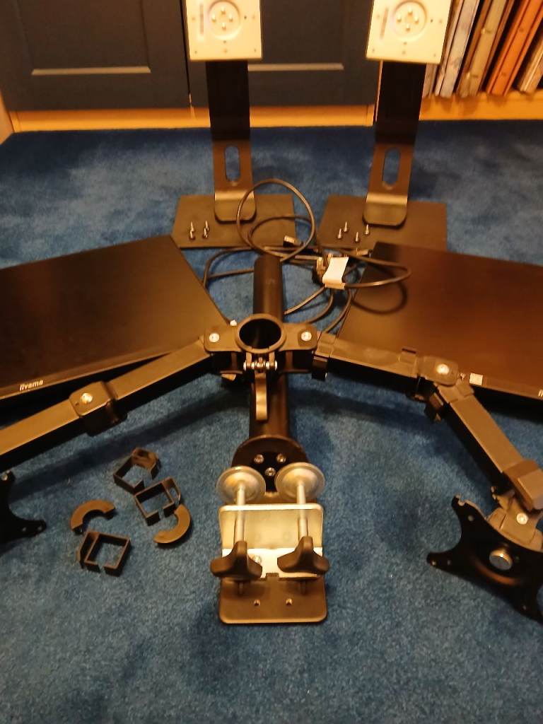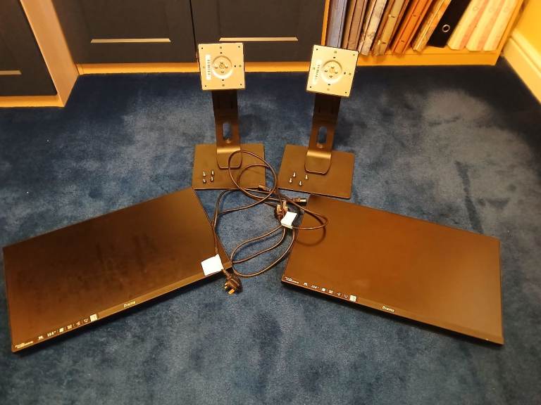 2 x 23.8" Iiyama ProLite XUB2493HS monitors with stands and desk arms. The monitors are used but in good condition and can either be stood on the desk surface on their stands or attached on a height adjustable central arm which clamps to the desk and allows independent positioning of the angle of each monitor, creating much-needed space on the desk surface. I will consider selling each monitor and/or the arms separately so please feel free to contact me if there are questions.