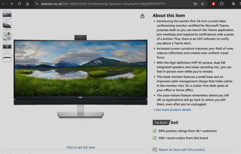 Dell C3422WE 34 Inch WQHD (3440x1440) Curved Video Conferencing Monitor, 60Hz, IPS, 5ms, Built-in Speakers, 5MP Camera, Mic, 2x USB-C, DisplayPort, HDMI, 4x USB