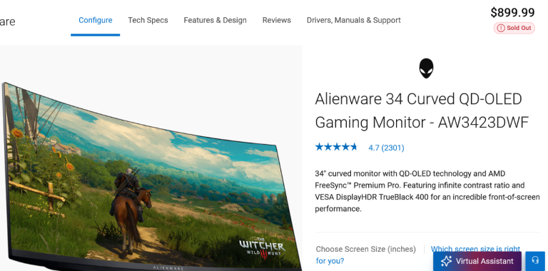 Alienware 34 Curved QD-OLED Curved Gaming Monitor, 165 Hz, 0.1 ms AMD FreeSync Premium Pro, VESA DisplayHDR TrueBlack 400 - AW3423DWF
