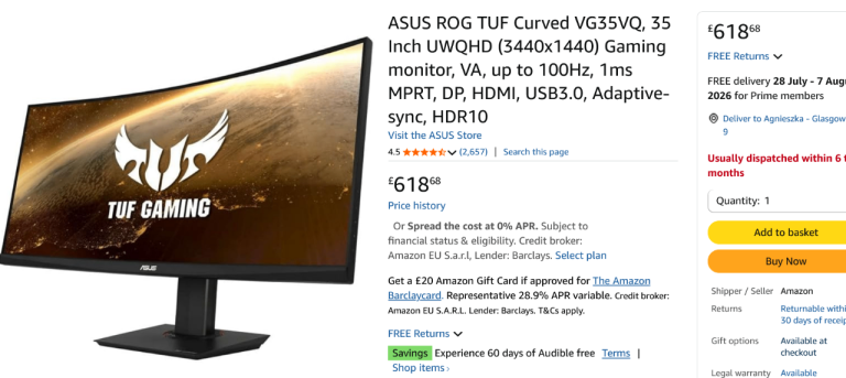TUF Gaming VG35VQ Gaming Monitor – 35 inch WQHD (3440x1440), 100Hz, Extreme Low Motion Blur, Adaptive-Sync,1ms (MPRT), Curved