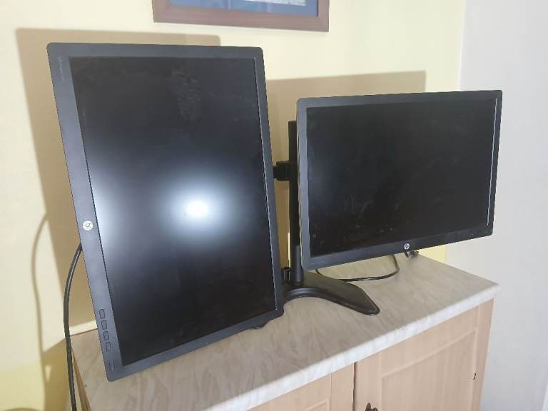 pair of HP E242 24inch monitors on twin arm stand