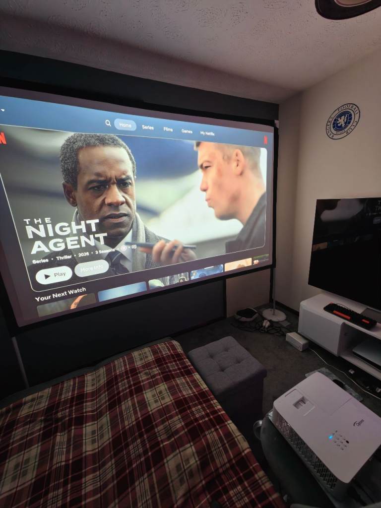 Optoma UHD35STx DLP Projector for sale with with a 100 inch screen, 3D Blu Ray player, two pairs of glasses and three movies. The bulb has only been used for 376 hours. The projector was £1249.99 brand new. I am happy to sell all of the above for £700.00, I simply don't have the space for it in...