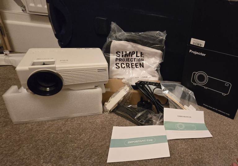 Used twice, working 💯. Projector features Bluetooth 5.1, HDMI/USB/AV ports, flexible table/ceiling setup, and an advanced cooling system. Netflix/Hulu require a TV stick, laptop, or Chromecast. Original price is £149.99.