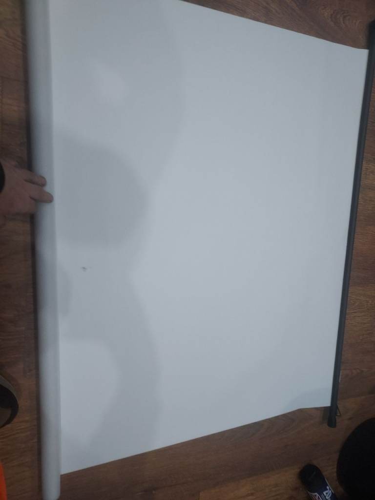 The electric tab tensioner screen size is 96 inches (8ft) (250cm by 140cm) and is kept in good working condition. When closed the whole metal bar is 290cm long so a large car or van will be required to collect.