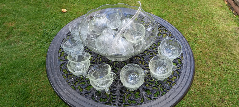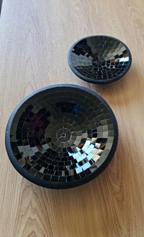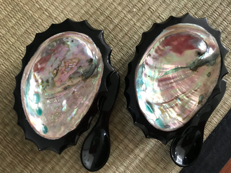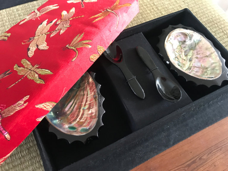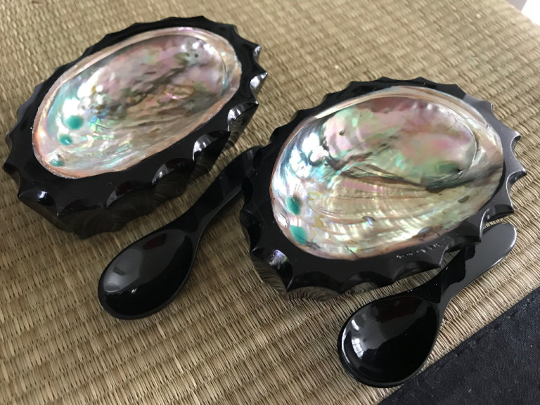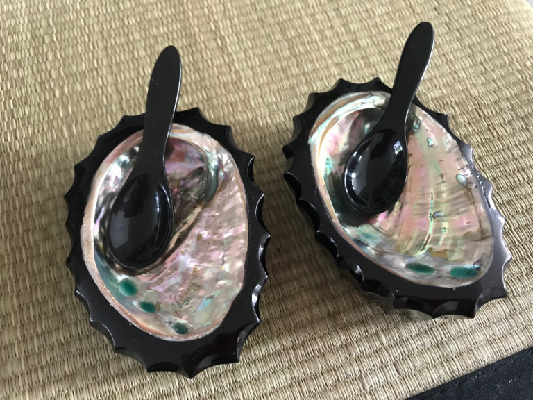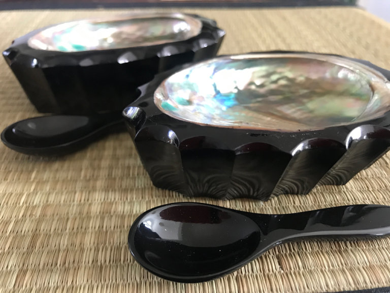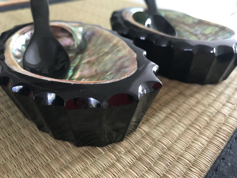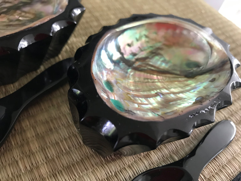 Mother of pearl containers with black lacquer moulding and lacquer spoons.