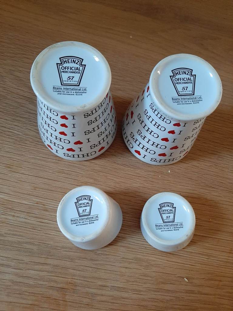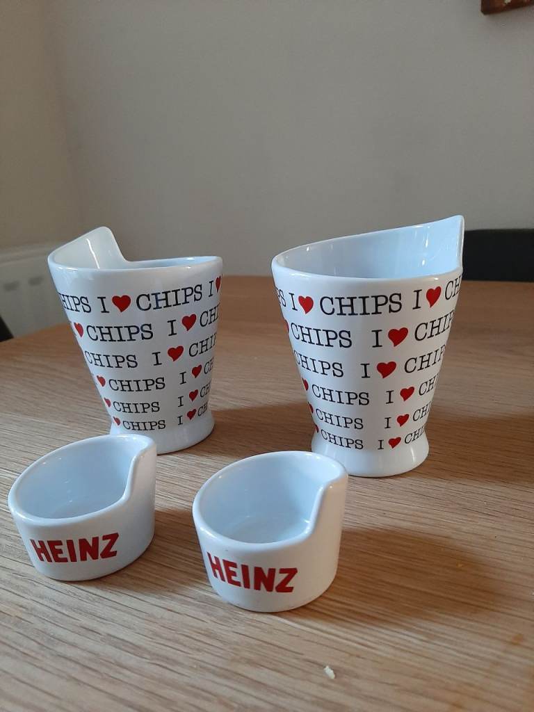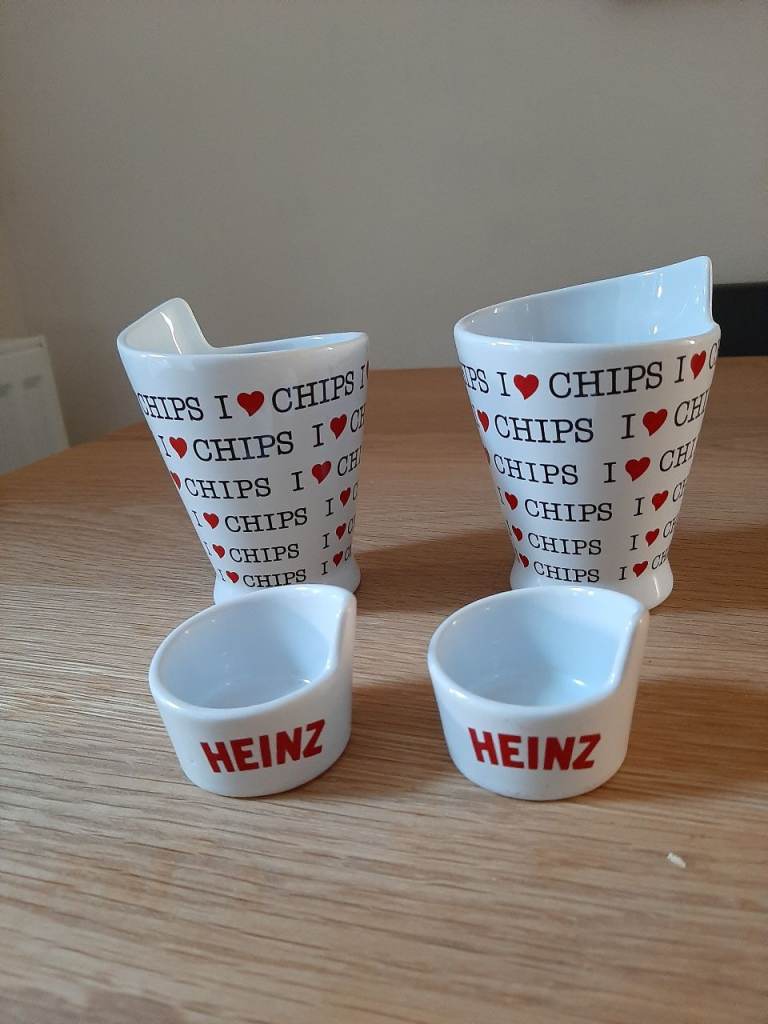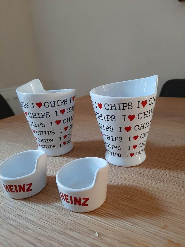 White Ceramic x 2 Chips Cone Cup Heinz 57 Official Merchandise I Heart Love Chips and x2 Heinz 57 ketchup holders .