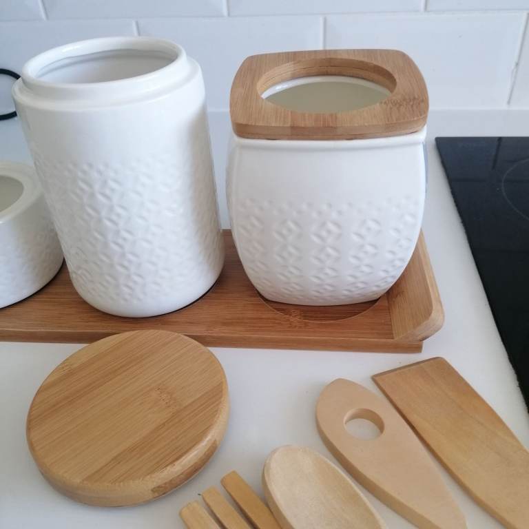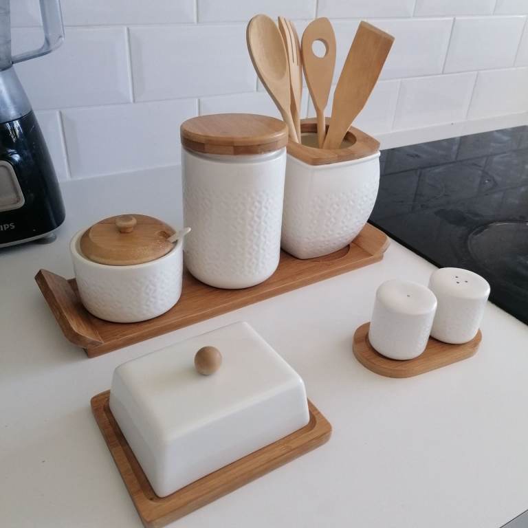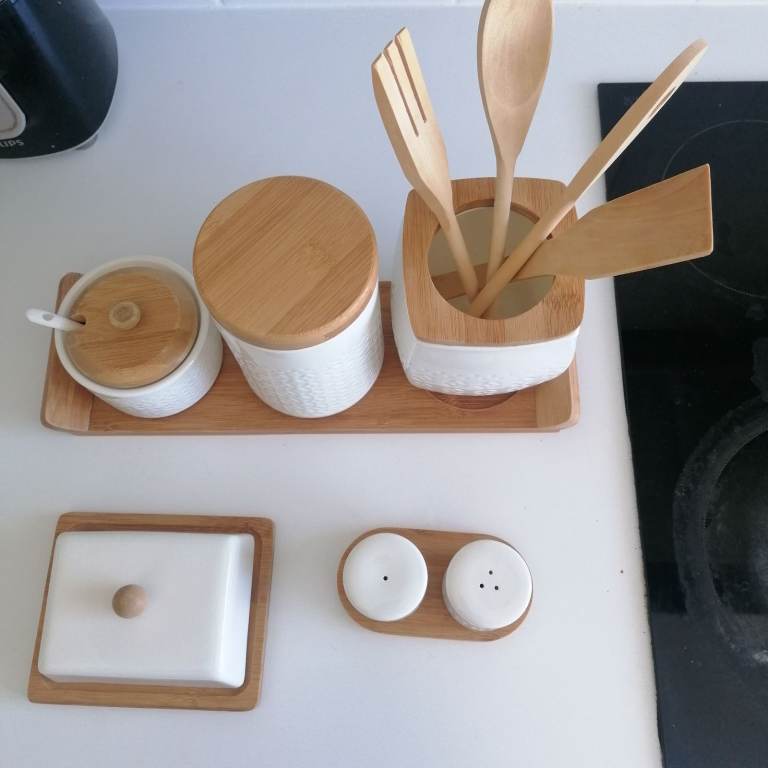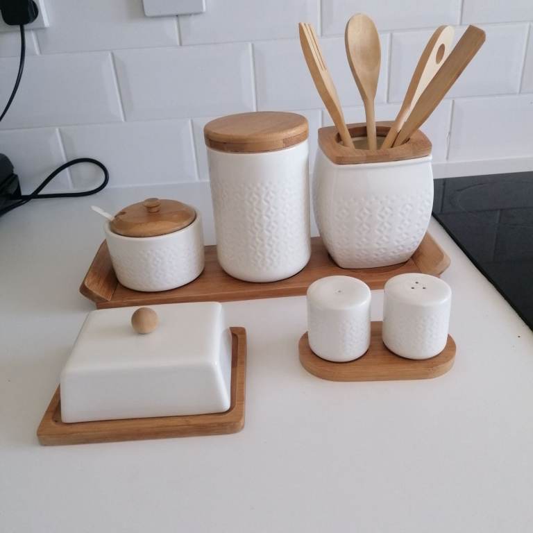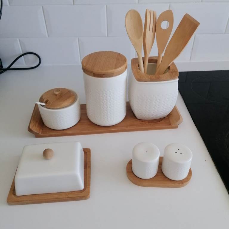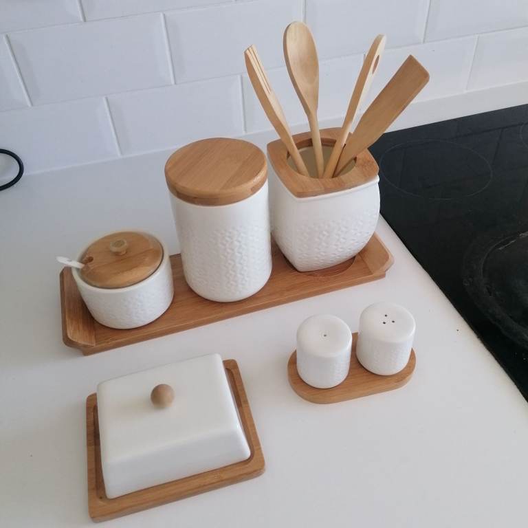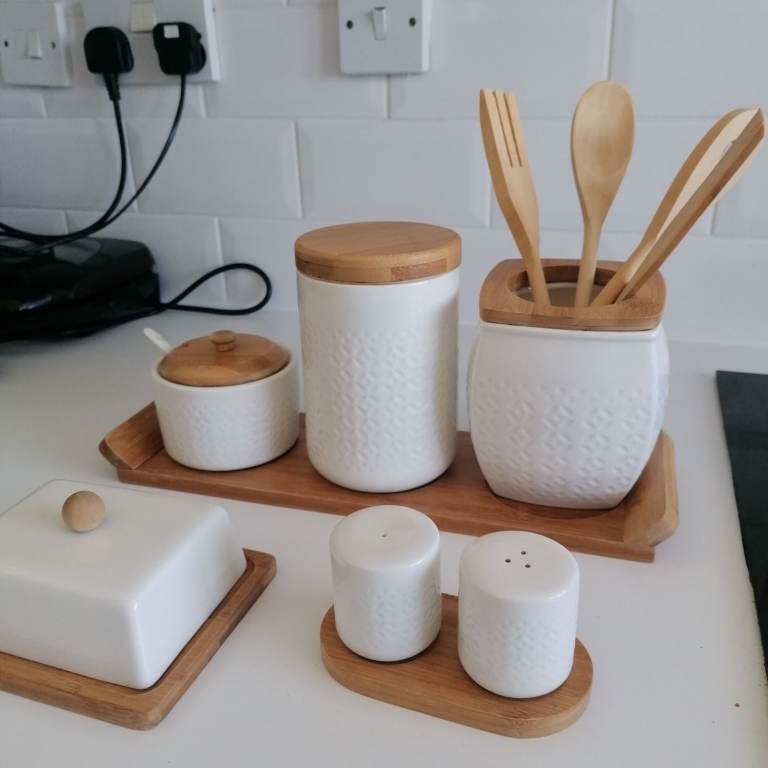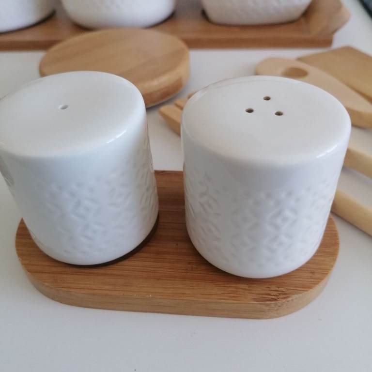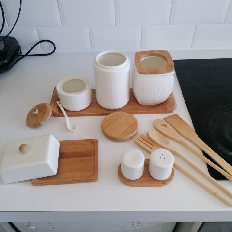 Beautiful porcelain condiments. Salt&pepper, butter, sugar, tea, jar with 4 wooden spoon. Porcelain + wooden lid + wooden tray. Perfect condition. Collection ONLY hence the low price. Price is for all items, NOT selling individually only as a set. Collection from N9.