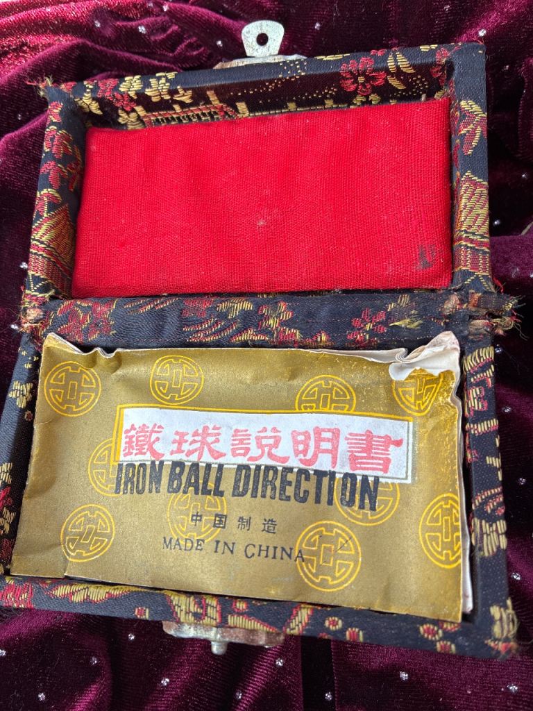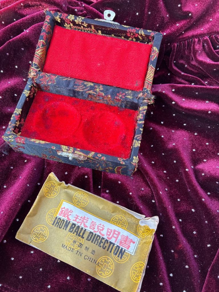 Lovely vintage box designed for Chinese health iron balls, lined with red velvet inside.