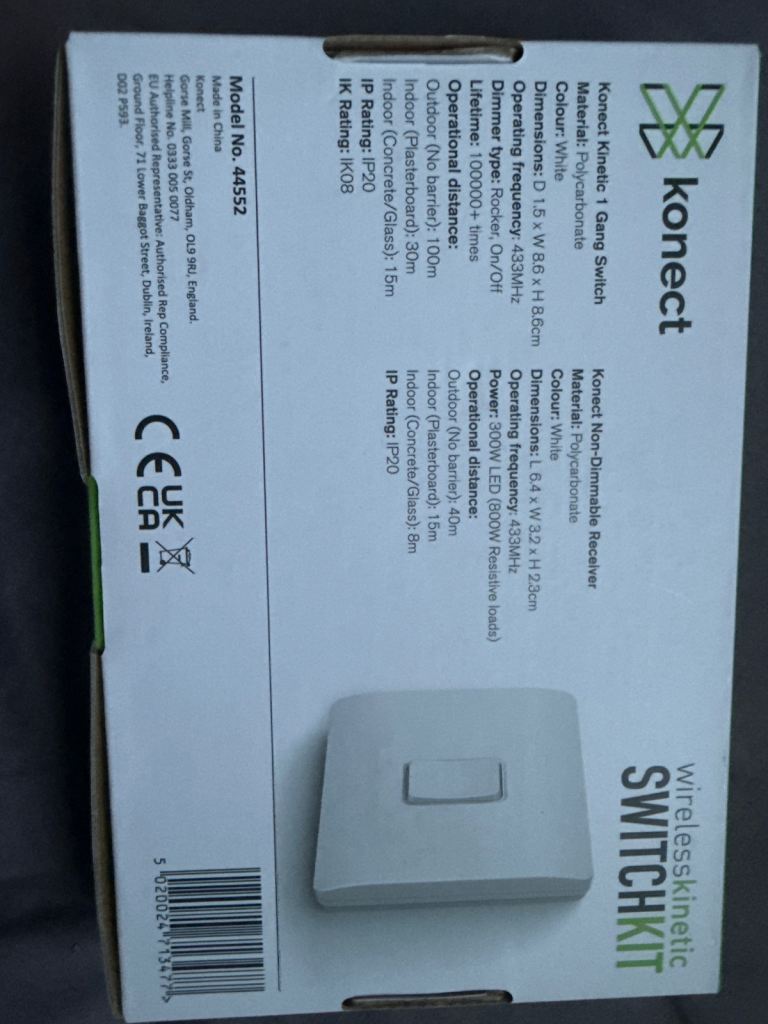 Wireless kinetic switch kit for sale. Brand new condition and fully working. I originally bought it for £40 but I recently moved house and no longer need it.