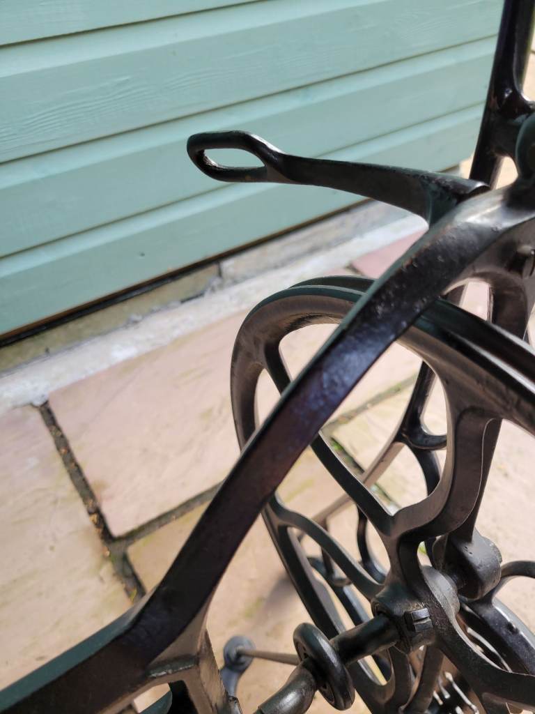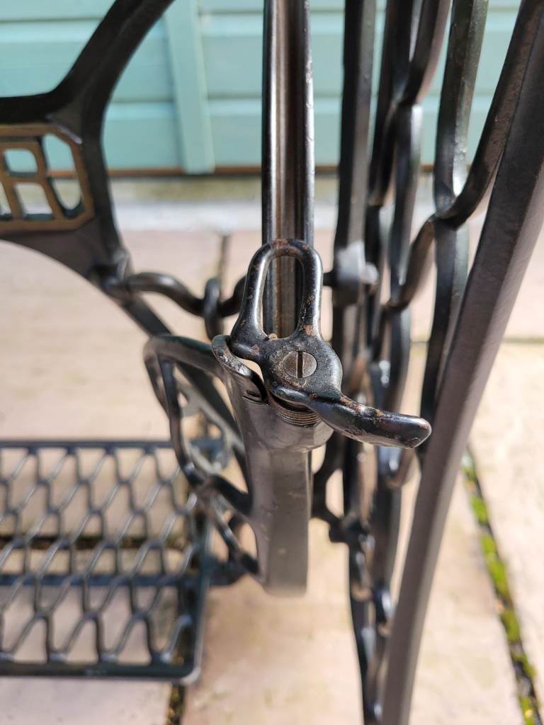 The base is very solidly made and in good condition. A Pitman rod links the working foot pedal to the pinwheel. The front belt guard and loop, as well as the rear belt guide, are also still in place from the time when this would have had a sewing machine attached to the top.