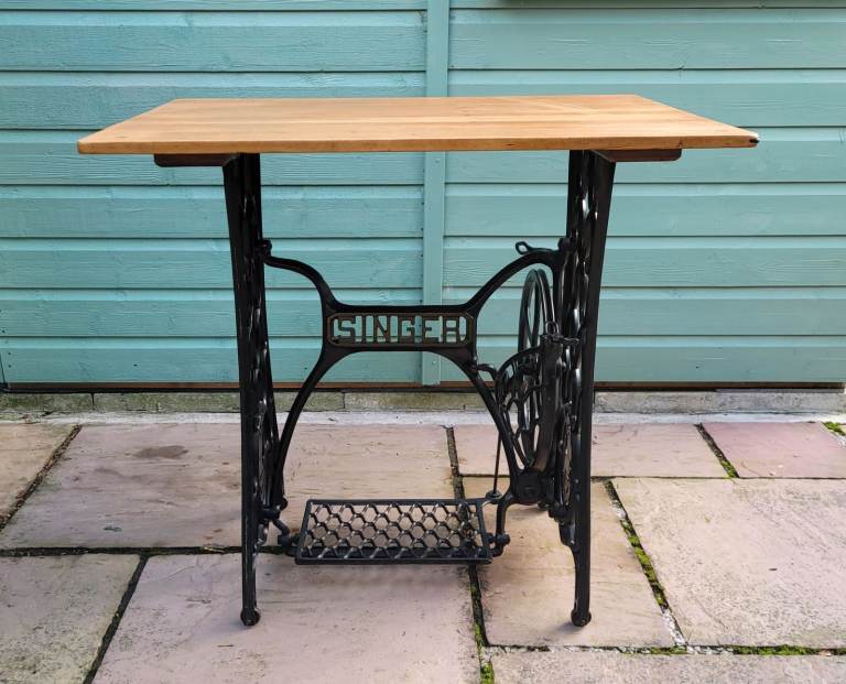 Own a piece of history with this antique Singer sewing machine treadle base, complete with a reclaimed wooden top used to form a lovely, industrial-style table.
