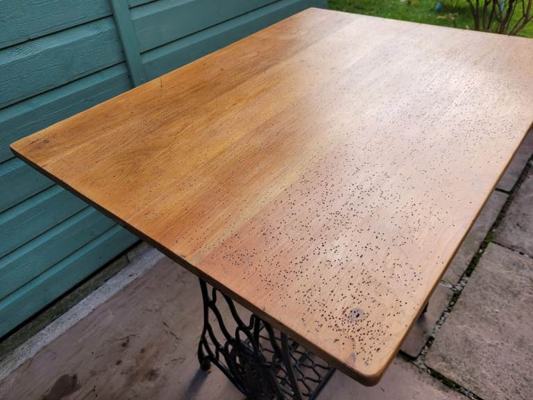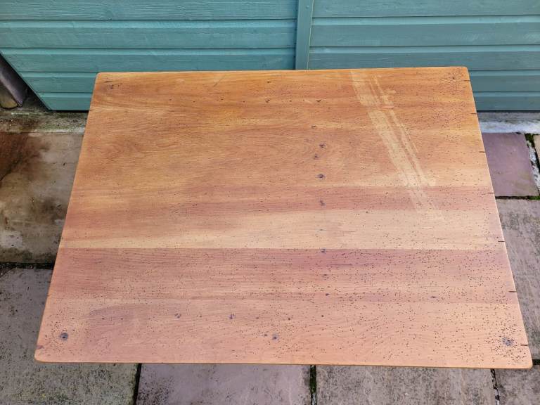 The wooden top is salvaged wood which I believe to be pine. It was previously used as a map pinboard, resulting in the tiny holes and marks you will see in the pictures. As the base is well over 100 years old, I wanted the top to be more in keeping with its age than a new bit of wood and to provide a more vintage feel. The wood has been sanded and several coats of oil have been applied to the surface and sides. The underside remains in its original condition.